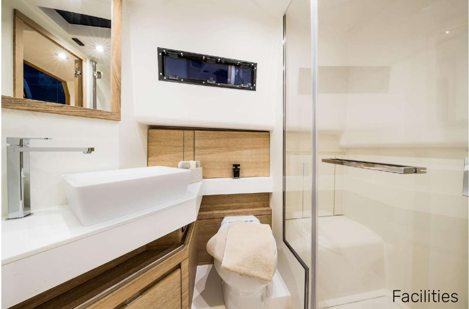 : 12V Sockets Cockpit table Gangway Air condition Cockpit speakers Cockpit shower Music player Swimming ladder TV/DVD/ Media palyer 220V sockets Generator Hot water Water maker Swimming platform Inverter 12V/220V Cockpit cushions USB charging ports Air heating Awnings & Parasols